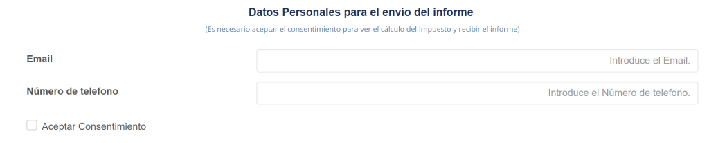 Esta sección es de vital importancia, ya que te mandaremos los resultados por email. Asimismo, te llamaremos en caso de que haya algún error en la introducción de los datos o alguna duda que haga falta aclarar para el cálculo del impuesto. Deberás aceptar el consentimiento legal para que podamos enviarte la información